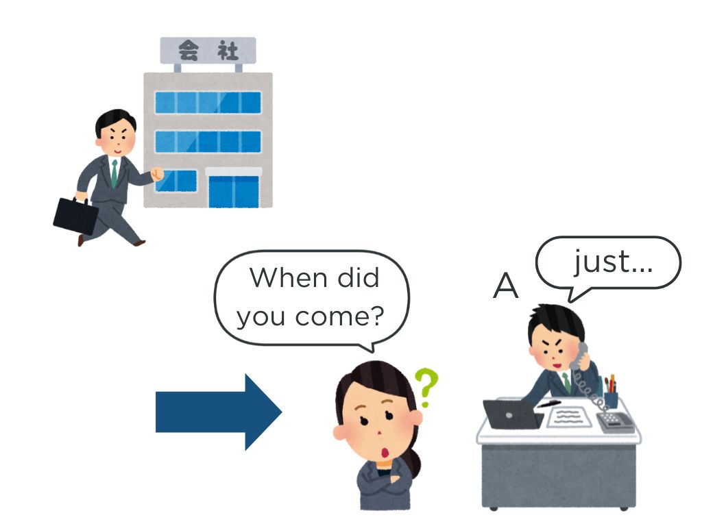 T:うちに帰りました、大阪に着きました、東京を出発しました、映画が始まりました、手を洗いました、さっき着きました、さっき先生に会いました、たった今起きました、たった今メールを送りました、ちょうど授業が終わりました