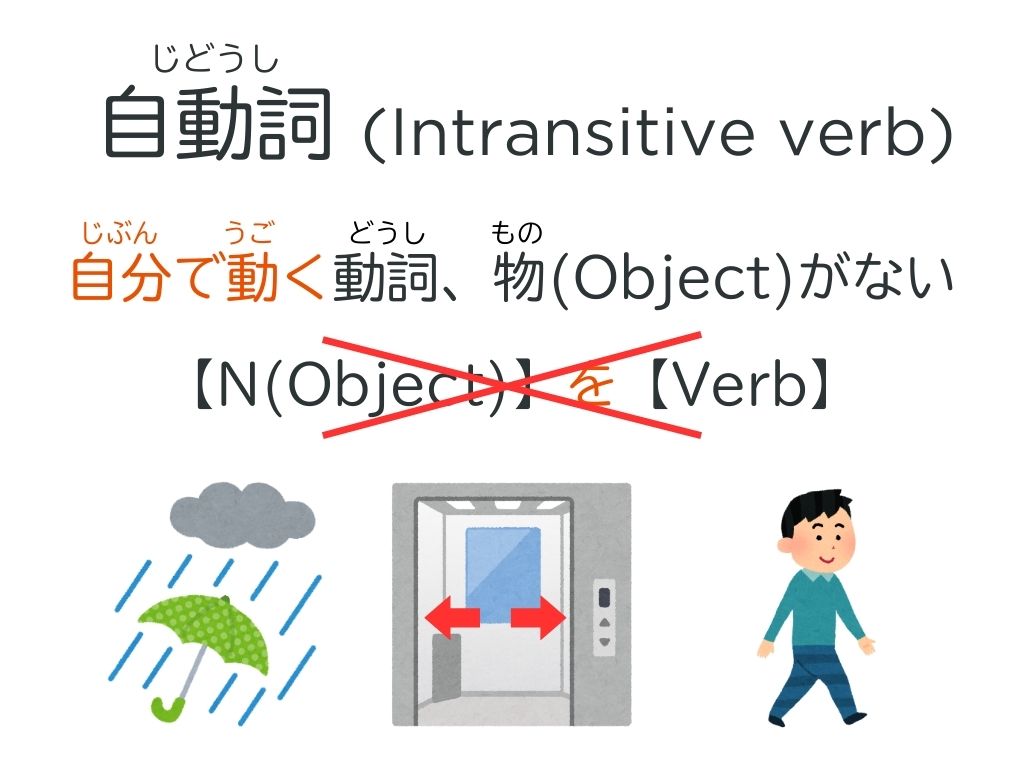 自動詞は「が」や、いろいろな助詞(particle)を使います。