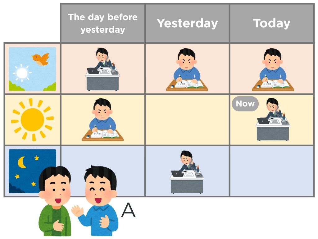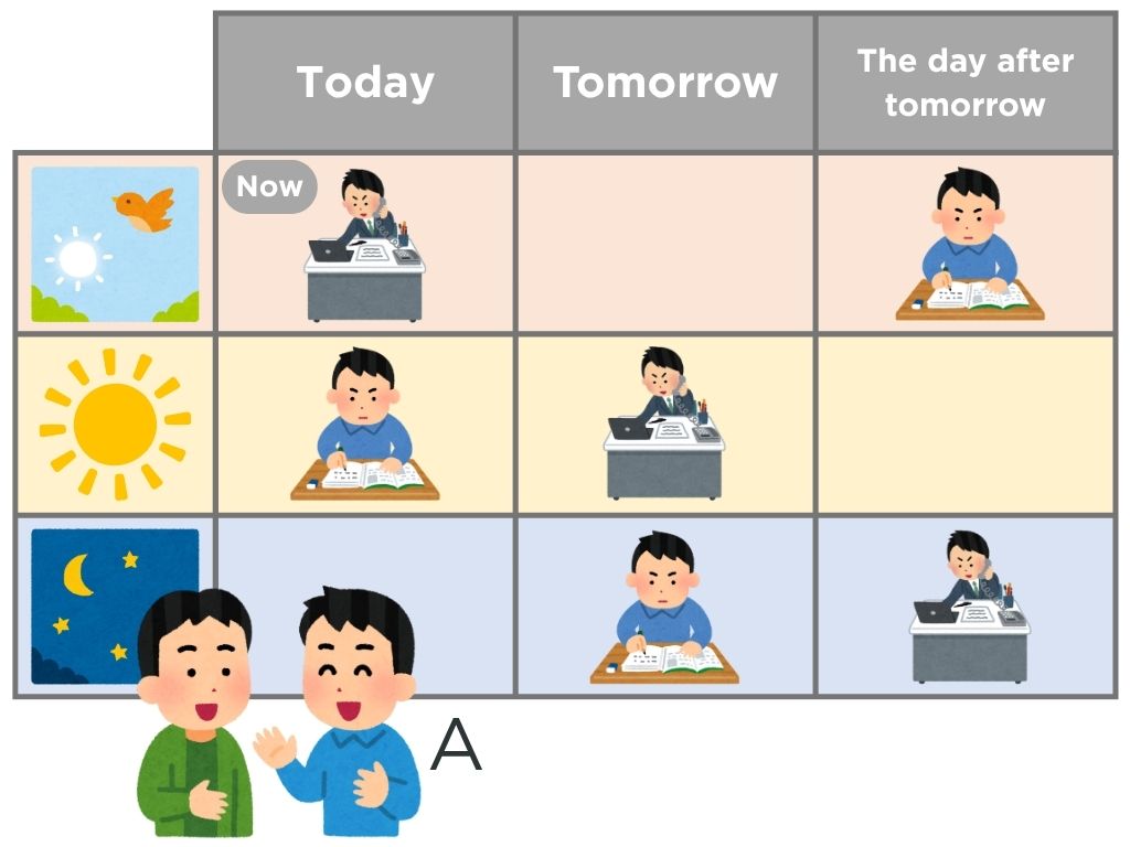 T:明日、あさって、毎日、毎朝、毎晩、~曜日、今晩、明日の朝etc