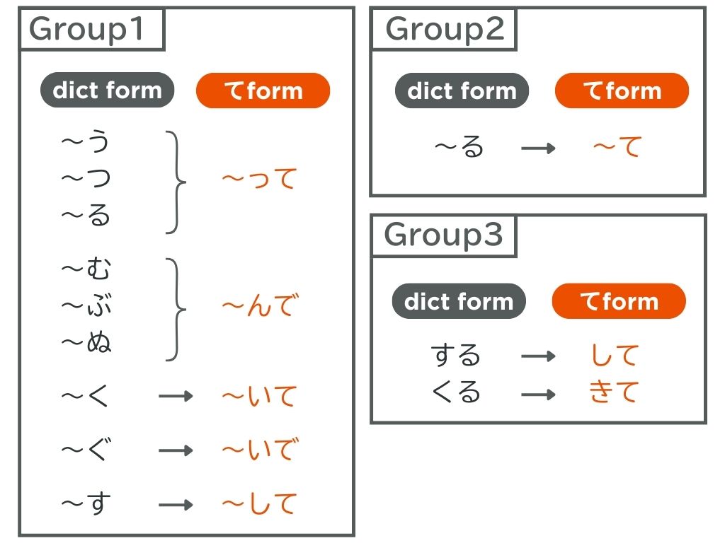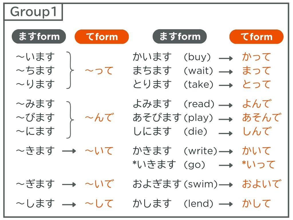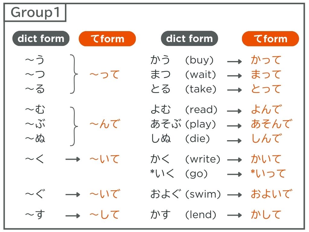 グループ1…行く、買う、飲む、書く、聞く、遊ぶ、泳ぐ、ある、呼ぶ etc.