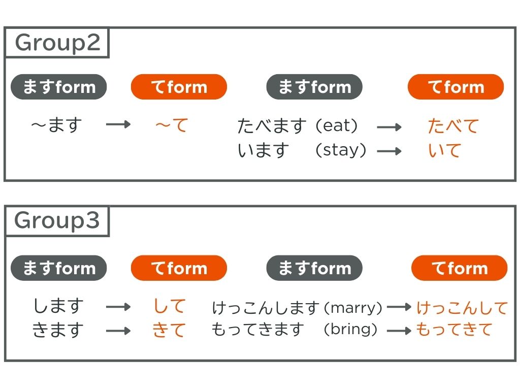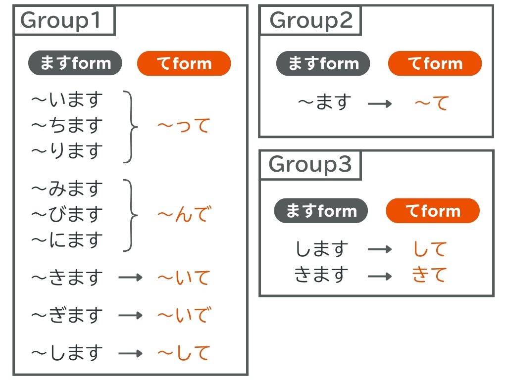 6課で説明したとおり、私は6課で辞書形とます形を導入してセットで覚えさせるようにし、動詞の活用形も辞書形からの変換を覚えさせるようにしています。ます形から動詞の活用形を覚えさせる場合は教科書の通り、「iます→グループ1」、「eます→グループ2」、「します、きます→グループ3」で大丈夫です。