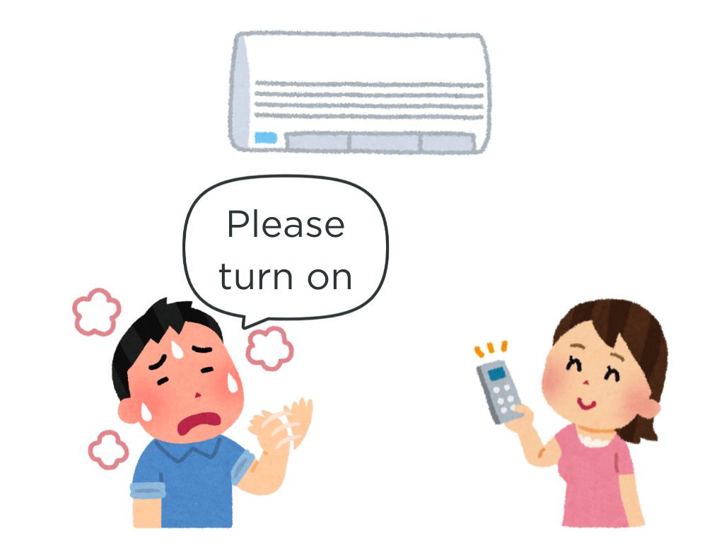 T:「エアコンをつけてください」は動詞のて形(てform)を使います。