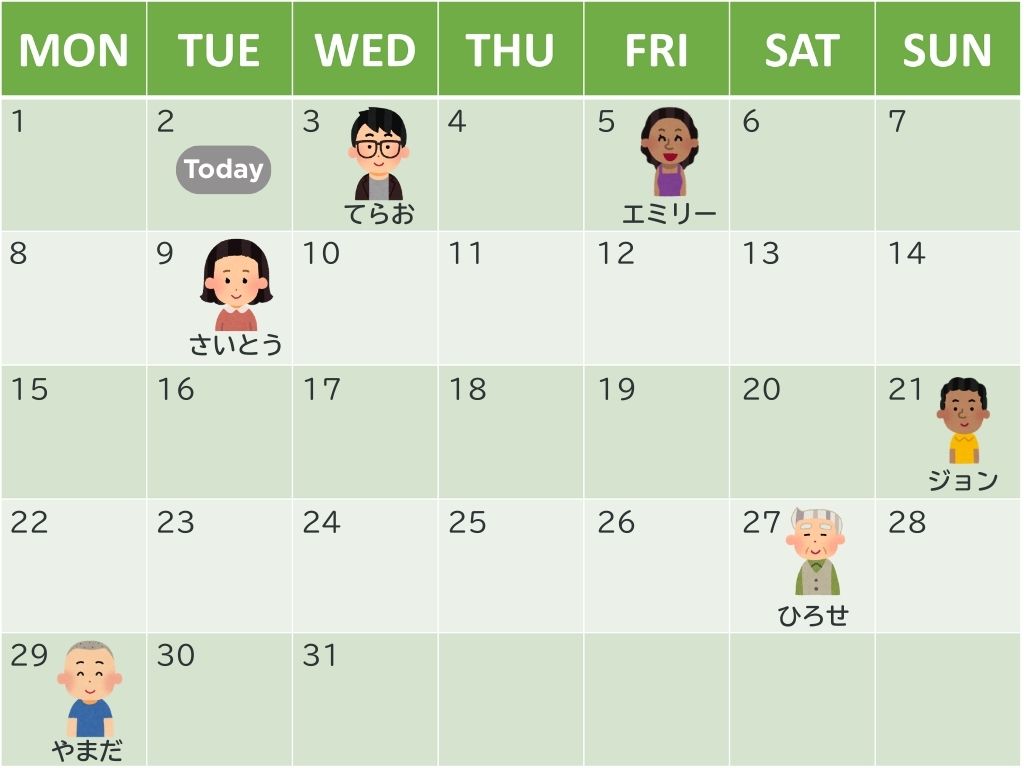 (カレンダーを指し、今日、明日、明後日、昨日、おととい、毎日→今週、来週、再来週、先週、先々週、毎週、というように、月、年まで確認)