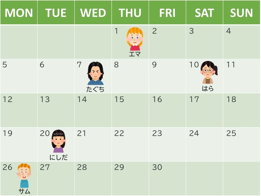 日にちを定着させるのはかなり大変です。1〜10日までは単純に覚えるしかありませんが、時間や月と同じく、4、7、9が例外で、14日→24日、17日→27日、19日→29日、と練習させ、最後に20日を導入します。今回の授業だけでなく、次の授業からも頻繁に日付を確認して定着させましょう。
